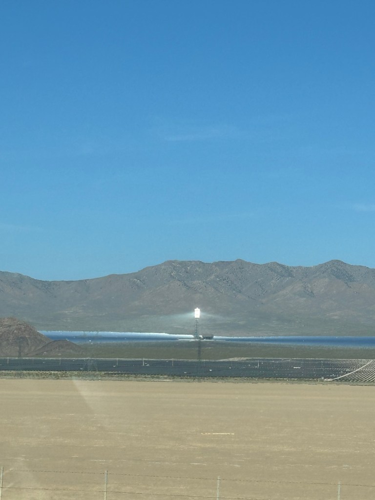 As we approached Las Vegas we encountered acres and acres of solar farms. We’d seen similar farms along I-15 but these were fascinating. They were installed just above the soil and ran close to the bottom of some hills. There were people racing dirt bikes, dune buggies, and rock crawlers between a cleared area close to the highway. Unlike the ones on I-15, these didn’t blind us and they had some interesting little house-like structures every 50 ft. We figured they were management huts that housed monitoring gear.