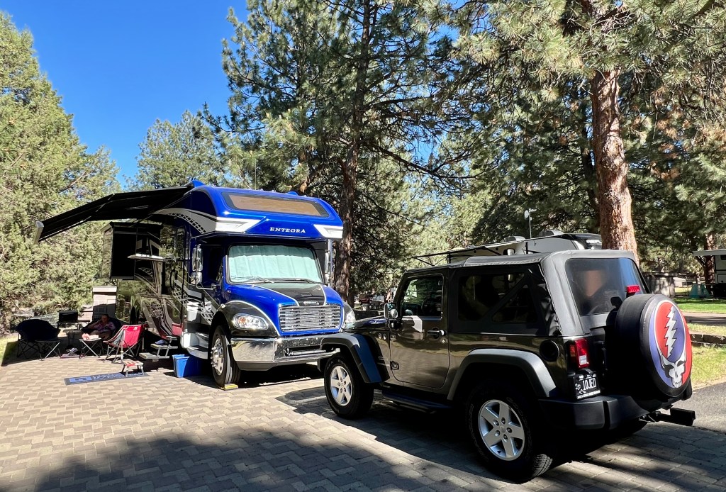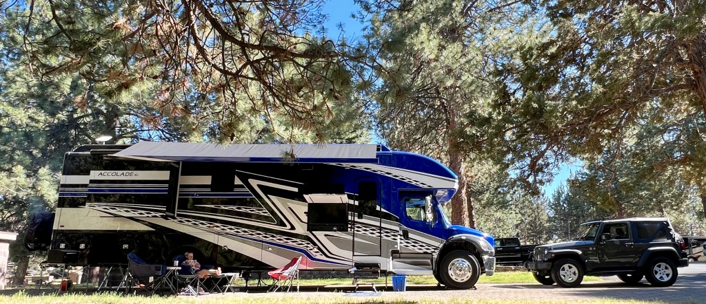 We rolled into Bend after the beautiful drive up the 97 from Klamath Falls. We wound through valleys and the Fremont-Winema and Deschutes National Forests. The road varied between 2 and 4 lanes, and there were trees, trucks, and trailers. Several of the little towns were clusters of mobile homes comprising housing areas and small businesses. We listen to an application called Autio that uses our location to describe some of the parks and the history of the areas we drive through. There are over 10,000 stories, and we learned a lot of interesting facts.