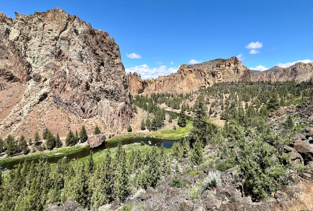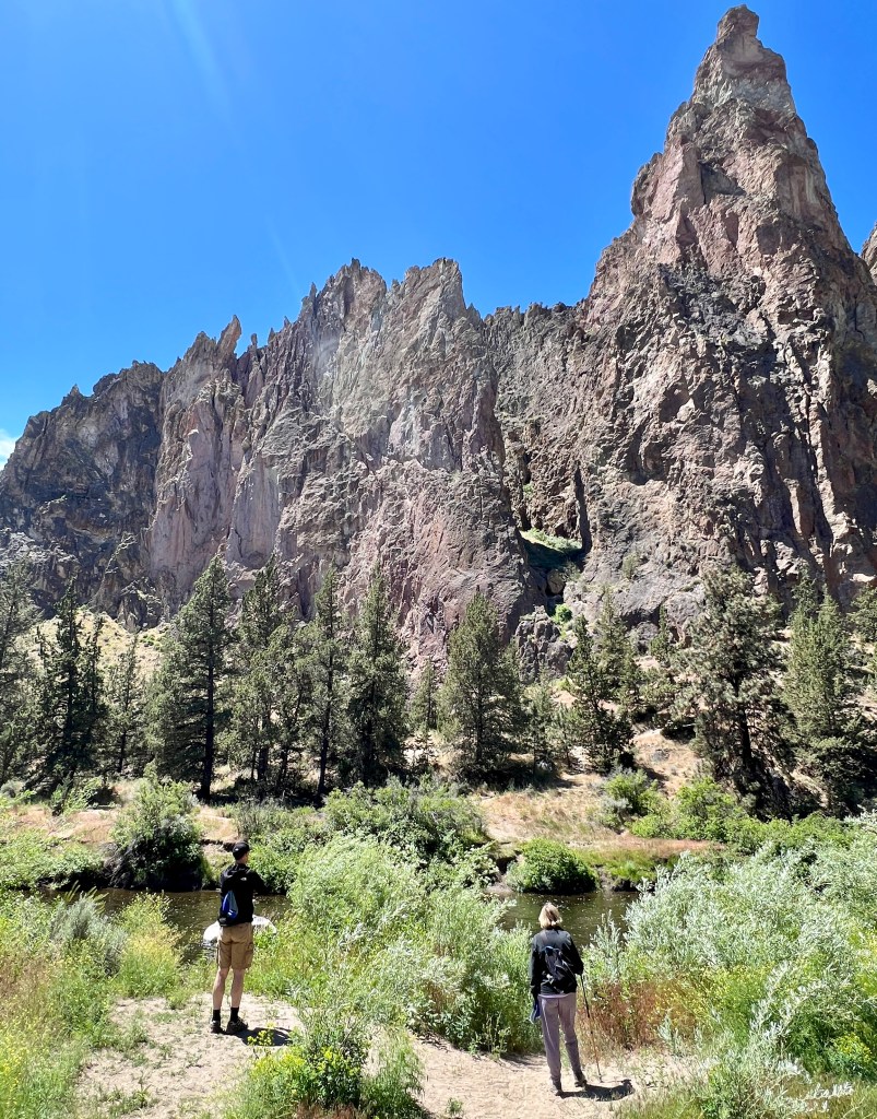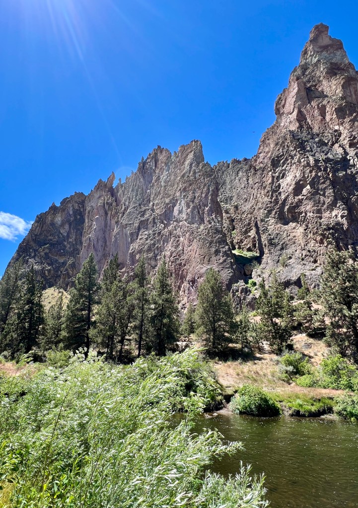 On Saturday, Caryn and her son and daughter-in-law played golf. Clint, Doug, and I went to Smith Rock State Park. As we approached the park, huge rock faces appeared to grow out of the ground. But when we got into the park itself, a deep canyon with a flowing river dropped hundreds of feet below us. We chose a hiking path opposite the rock walls that seemed less traveled. As we walked along, our eyes focused on the various climbers affixed to the steep walls. Smith Mountain is well known for its varying degrees of difficulty in the rock climbing community. We were amazed at the beauty of the rock and the fearlessness of the climbers. Heights and slippery rocks are not our cup of tea, but it was very cool to see. We wandered close to a golden eagle nesting space but did not see any. After making our way along the trails, we found ourselves in a section of the park called the bivouac area. We said bivouac as many times as possible the rest of the day.