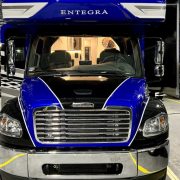 I’m going to take a short pause here and comment about Althea. She’s quite a striking beast with bold blue, black, and white graphics all over. At 40 feet long and 14 feet tall, she definitely stands out, especially in an RV park full of beige and white boxes. We always get a lot of attention and many comments about what a good-looking rig she is.