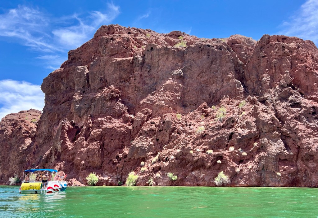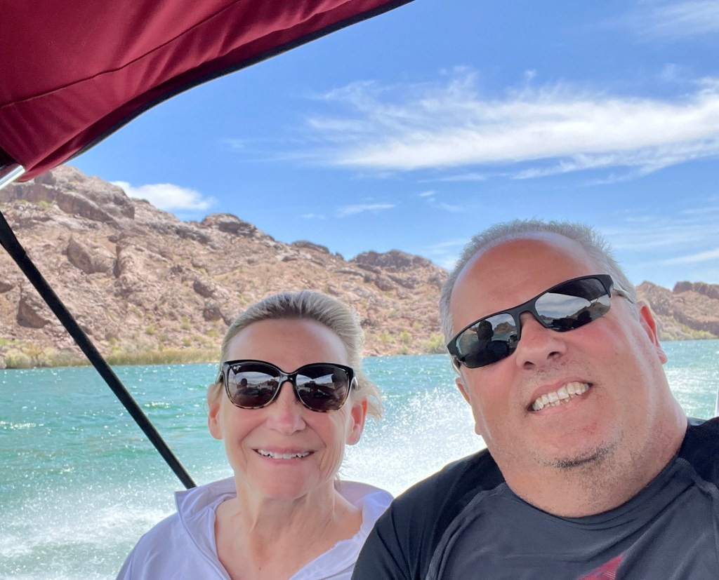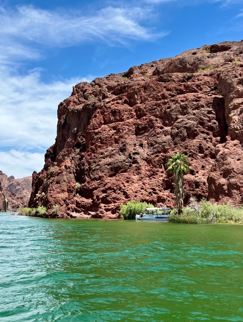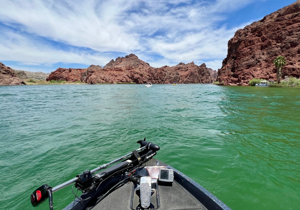 The next day, we worked the morning, then met Janet and her friend Angie at the London Bridge Resort, where we proceeded out to the docks and boarded Bob’s boat. He’d already been out fishing early in the morning with Angie’s son Trevor. The six of us set off on our tour of the lake, river, and gorge area just north of the lake. We had an awesome time, speeding across the water and leisurely floating.